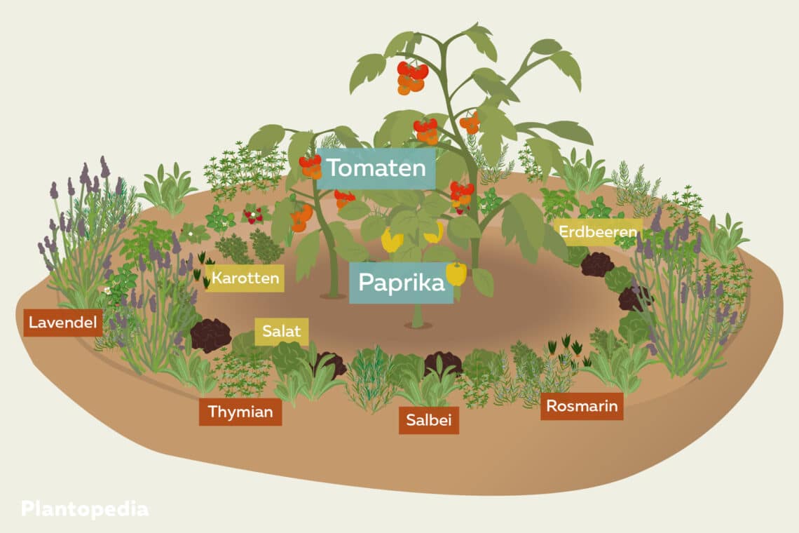 Zum einen wird das Beet im Inneren stufenförmig angelegt. Es entsteht also eine Art runde Treppe. Zum anderen wird jede Stufe entlang des Randes mit Steinen befestigt. Die Stufen selbst bleiben dadurch bepflanzbar.